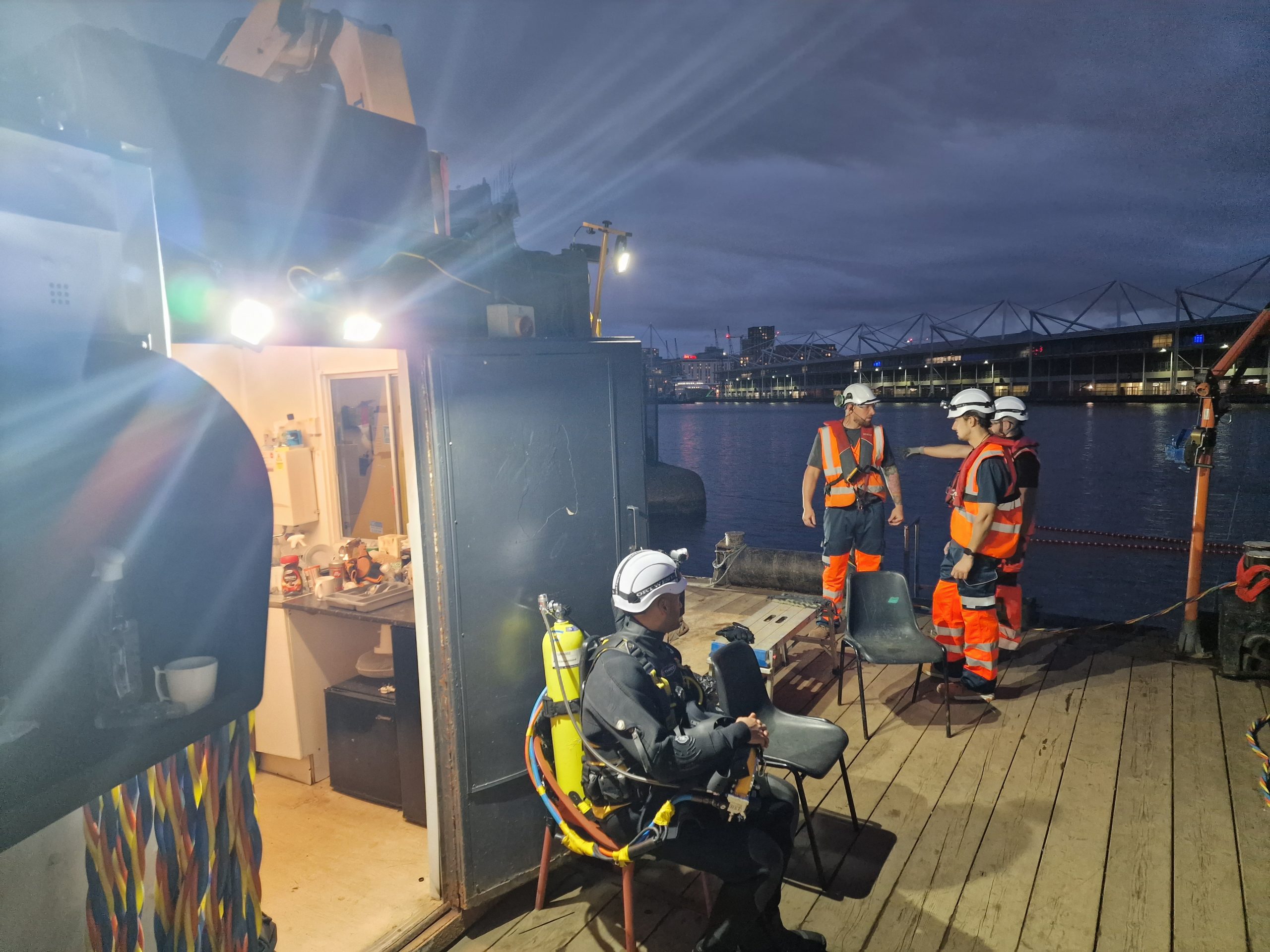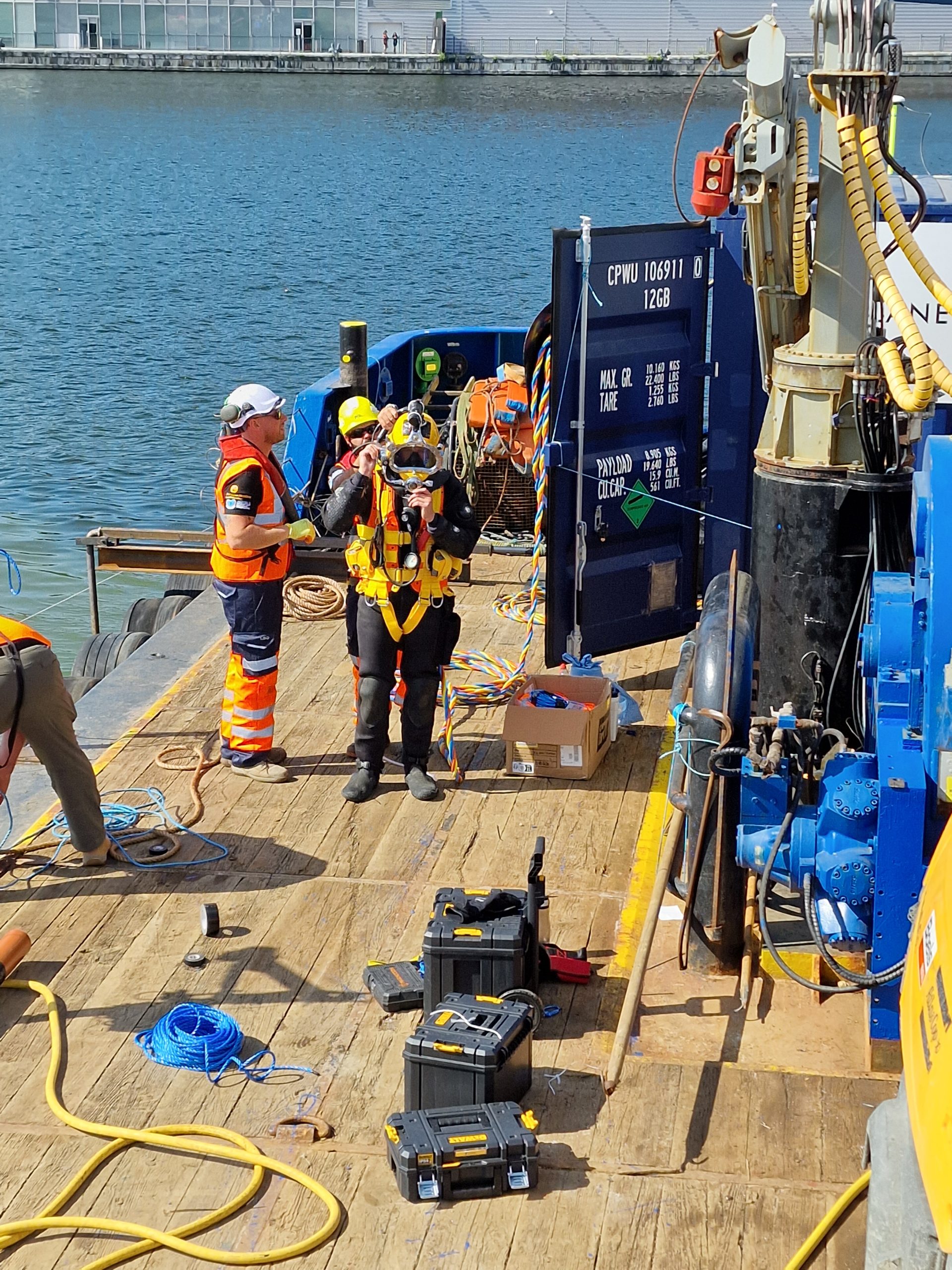 Experienced UXO qualified divers are generally the most efficient way to identify a pUXO particularly in shallow water and water with poor visibility. Using coordinates dictated from the non-intrusive survey the diver will conduct a search, circular or jackstay type searches depending on the seabed, visibility etc. Once the target is found a UXO qualified diver will identify the pUXO. There is a strict no touch policy when working around pUXO, however, in nil visibility the only way a diver can identify the pUXO is by feel. If the target is identified as a cUXO the UXO will be marked.